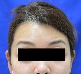 A.おでこの横ジワの治療では、基本的にはまず患者さんに眉を上げて目を大きく開いてもらったり、おでこにシワを寄せてもらいます。それからシワの目立つ部分を中心にシワの寄り方を確認しながら7ヶ所~9ヶ所、バランスよくボトックスを注入します。