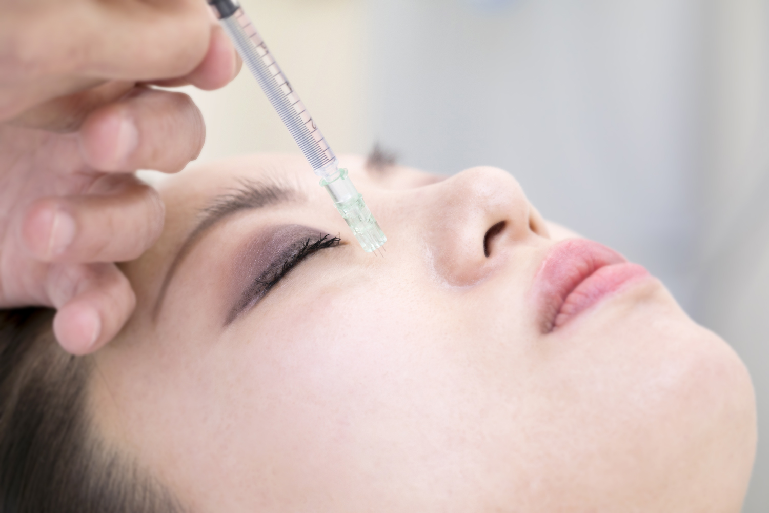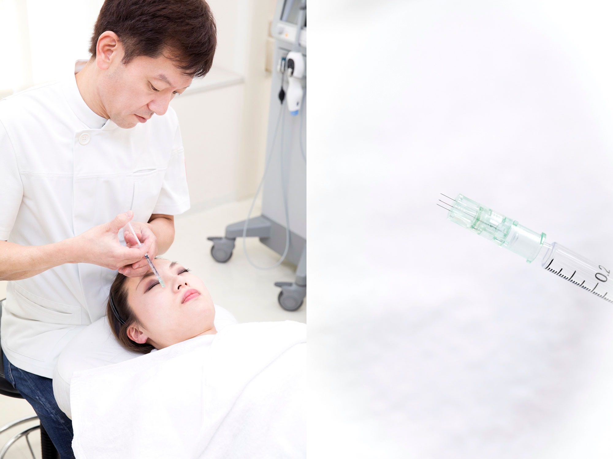 A.元々、表情ジワを改善するための治療、ボトックス注射を応用したもので、適量のボツリヌストキシンを注入することで皮脂腺や汗腺の働きを抑えます。毛穴が開いてしまうのは、皮脂がたまり、それを外に出そうとするから。筋肉の働きを抑える効果のあるボトックス注射ですが、それを筋肉に打つのではなく肌の浅い層に細かく打つことによって、皮脂腺や汗腺などの働きをストップさせ、毛穴をだんだん閉じるようにするものです。幅広く細かく打つため、当院では均一に打てるよう、注射針が極細で小さな3本になっているタイプを使用します。